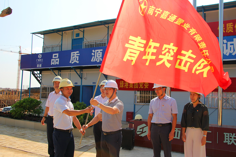 南寧空港科技產(chǎn)業(yè)園項目是南寧空港經(jīng)濟區(qū)的重點龍頭標(biāo)桿性產(chǎn)業(yè)項目,也是南寧市重點督辦的建設(shè)項目。為了更好地服務(wù)項目工程建設(shè),進一步發(fā)揮黨員的先鋒帶頭作用和青年同志們的工作熱情,確保一期工程按時交付和整體項目早日竣工投產(chǎn),2018年9月29日上午,綠港集團黨委在空港科技產(chǎn)業(yè)園項目施工現(xiàn)場隆重舉行“黨員先鋒隊”、“青年突擊隊”、“工人先鋒號”授旗儀式暨“一線送清涼”活動,綠港集團黨委書記、董事長、總經(jīng)理龔國強,副總經(jīng)理鄧繼慧,副總經(jīng)理黃克,副總經(jīng)理、工會主席黃麗琴,項目“黨員先鋒隊”隊員、“青年突擊隊”隊員、項目一線建筑工人代表等共約80人參加了活動。