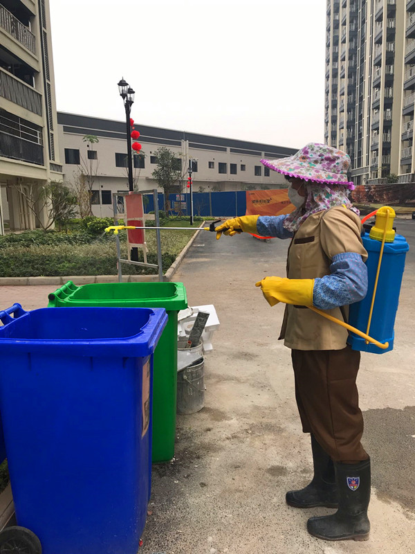 萬方物業(yè)公司正在對(duì)園區(qū)進(jìn)行消毒消殺