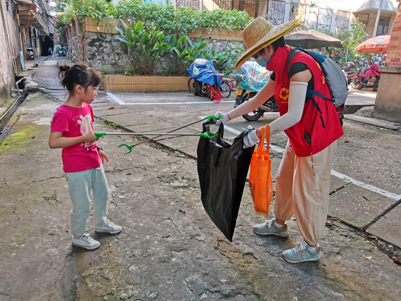 雖然他們年紀(jì)小,但是創(chuàng)城志愿服務(wù)的熱情卻十分高昂。李悅歌小朋友早上一到工作地點(diǎn)就迫不及待地去找工具,一直問媽媽我們能做什么,我們要做什么,甚至連早餐都顧不上吃。一個上午她跟隨著媽媽,對槎路社區(qū)的小廣場進(jìn)行了打掃,清理了球場維修時打碎的玻璃渣子和積水區(qū)。隨后,她又跟隨著媽媽進(jìn)入到小區(qū)里,撿拾居民丟棄在外面的垃圾。一開始由于個子比較小,拿的夾子有點(diǎn)長,她控制不好,怎么夾都夾不住那個小小的煙頭,經(jīng)過她反復(fù)實(shí)驗(yàn)終于掌握了力道,知道夾子靠下面的部分比較好控制,容易把物品夾起來。在掌握了竅門以后,她開啟了瘋狂“尋寶”的過程。她就像發(fā)現(xiàn)寶藏一樣去發(fā)現(xiàn)丟棄在樹葉、花圃帶、水溝里面的煙頭,甚至比志愿者姐姐和阿姨們發(fā)現(xiàn)的還快,每當(dāng)她撿拾到煙頭,她都特別的興奮。志愿者阿姨們也從草叢里將垃圾撿拾出來,讓她負(fù)責(zé)把煙頭和垃圾放到黑色的垃圾袋里。
