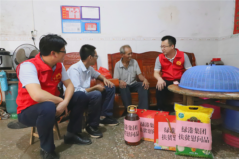 綠港集團(tuán)黨委書記、董事長(zhǎng)龔國(guó)強(qiáng),黨委副書記、總經(jīng)理鄧?yán)^慧在貧困戶梁承營(yíng)家開展慰問(王振霖 圖)