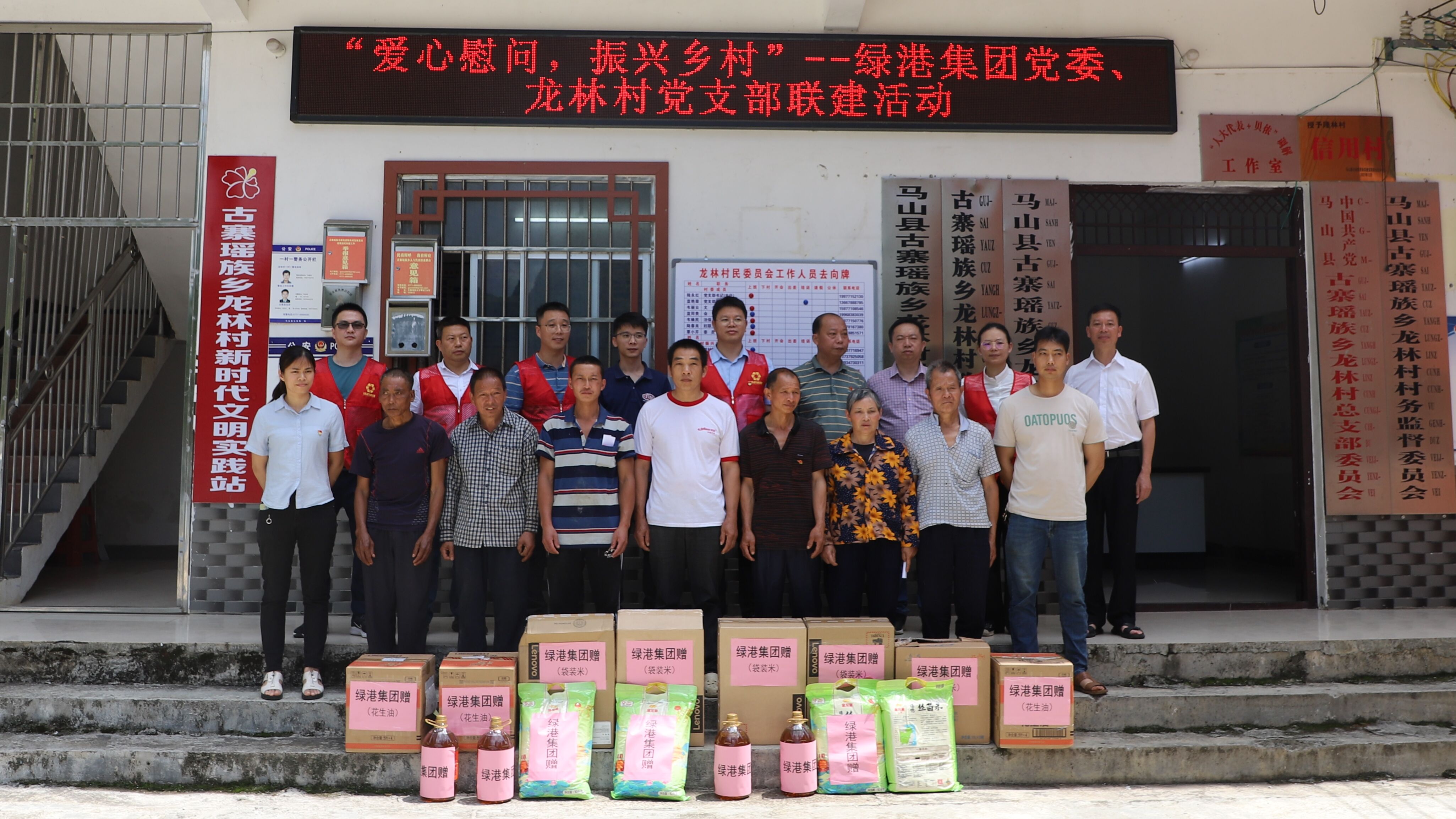 5月29日,綠港集團(tuán)黨委副書記、總經(jīng)理鄧?yán)^慧,黨委委員、副總經(jīng)理陸羿冰,黨委委員、副總經(jīng)理陽正輝,以及集團(tuán)黨委辦和萬方公司黨支部的部分同志代表集團(tuán)黨委,到對(duì)口幫扶的馬山縣古寨瑤族鄉(xiāng)龍林村開展村企聯(lián)建慰問活動(dòng)。綠港集團(tuán)派駐龍林村第一書記梁華以及龍林村干部、駐村工作隊(duì)員一起參加了活動(dòng)。